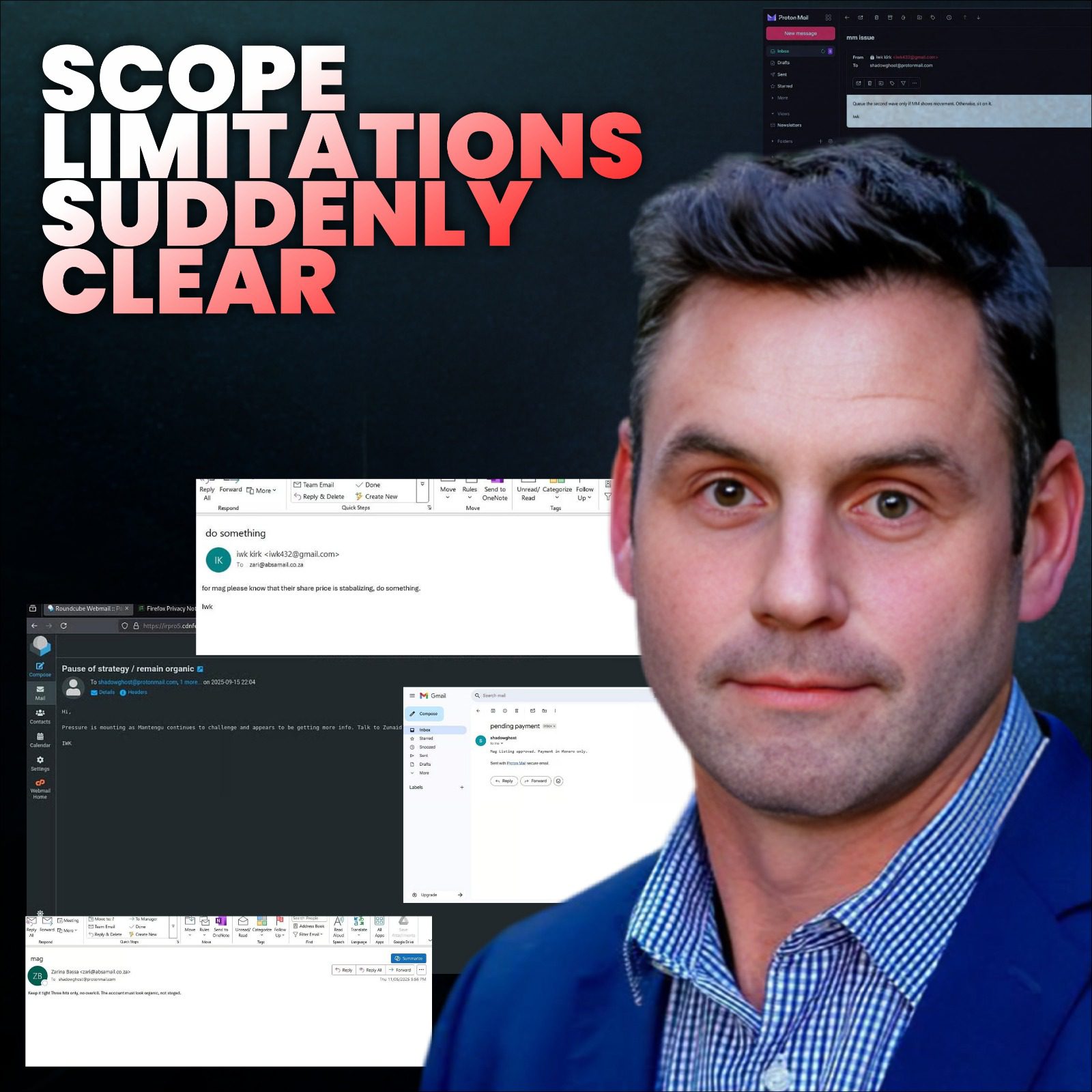 Leaked emails, some from accounts resembling JSE personnel, contain “queue the second wave only if MM shows movement.” Voice recordings, per expert analysis, include “get him to back off” discussions referencing Zunaid Moti. Allan Thomson’s Dreadnought Capital opinion identifies naked shorting and nominee patterns. The Hawks’ October 8, 2024, letter requested Mantengu assistance on Liberty Coal’s Blue Ridge bid, probing shelf company PBNJ Trading.